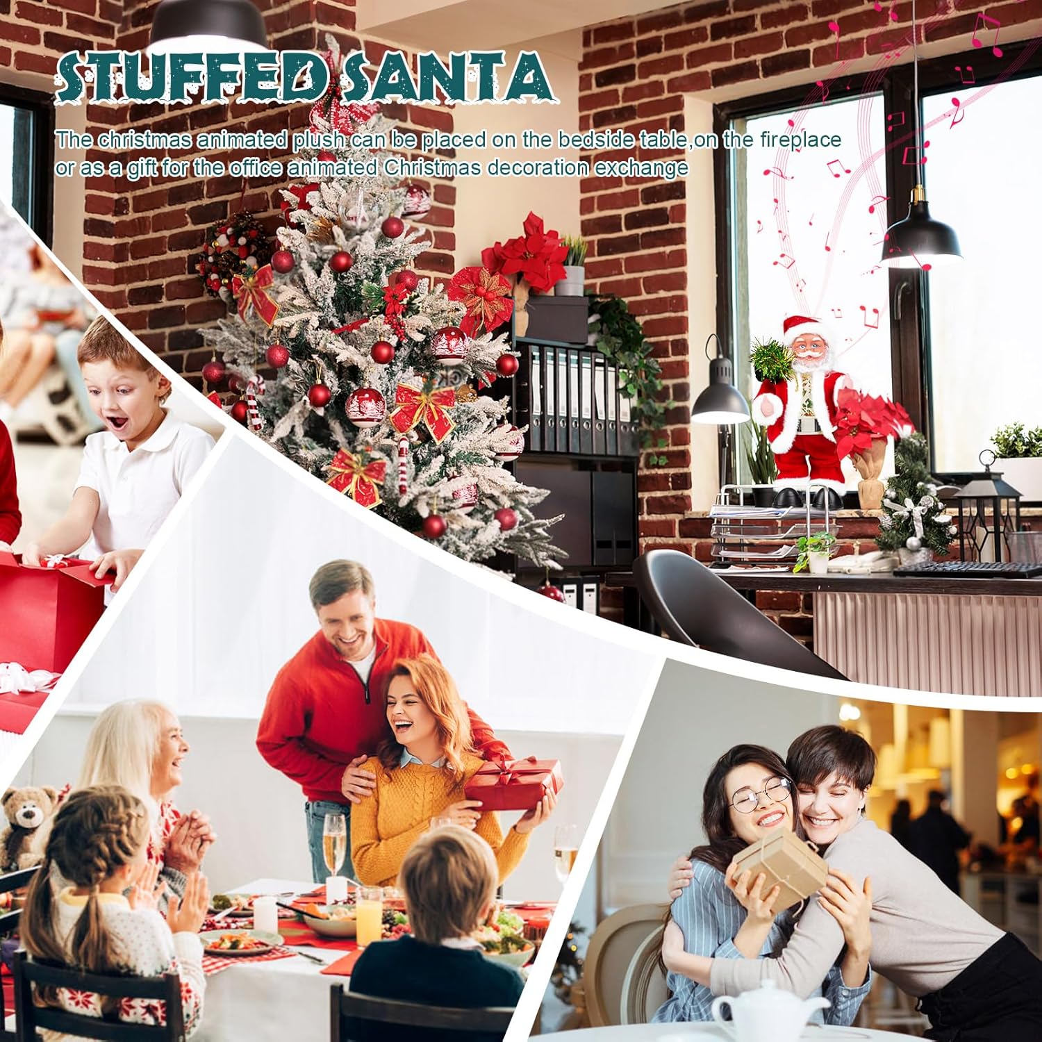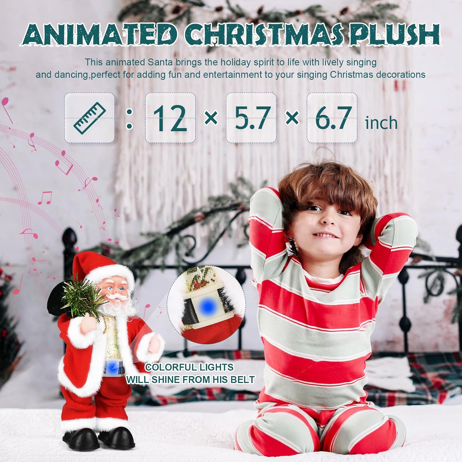 Animated Christmas Plush: Simply lift the back of santa claus doll clothes, insert 3 * AA batteries (not included),flip the switch next to it and the animated christmas toys will start his talent show.Colorful lights will shine from his belt.This animated Santa brings the holiday spirit to life with lively singing and dancing,perfect for adding fun and entertainment to your singing Christmas decorations.