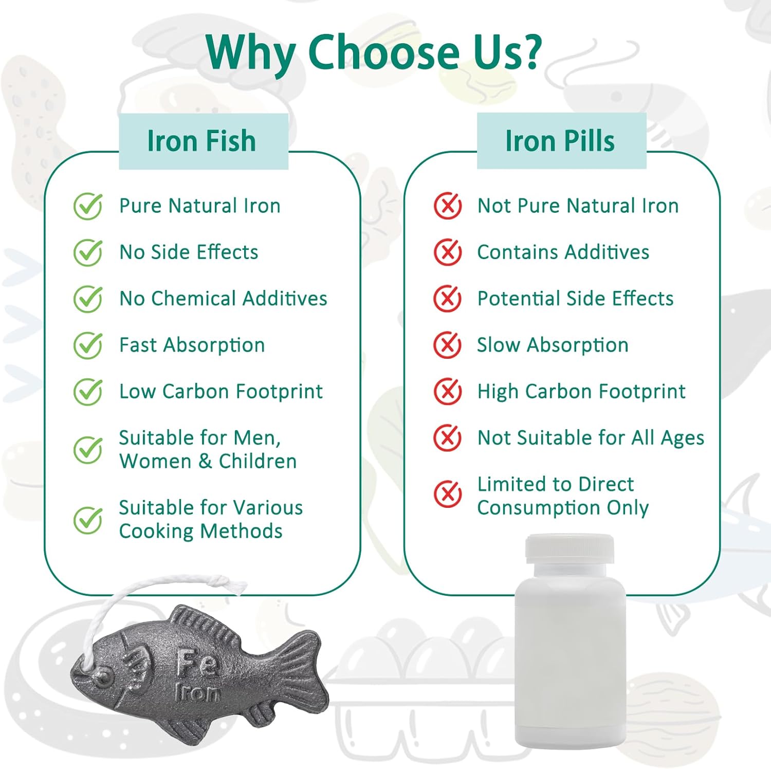 A reusable cooking tool that naturally infuses meals with 6-8mg of absorbable iron (≈40% of daily adult requirement) via water. Ideal for iron-deficient groups: pregnant/menstruating women, vegans, vegetarians, athletes, and blood donors.