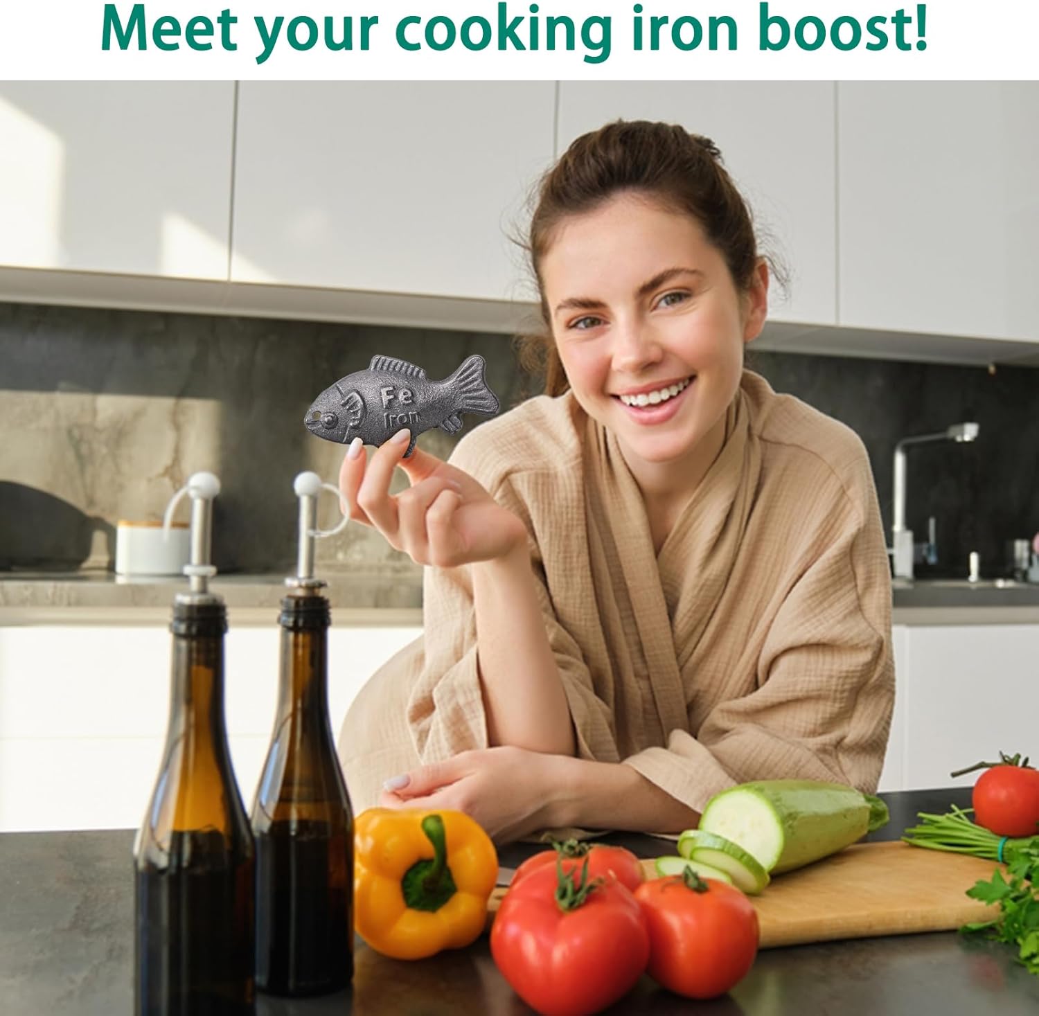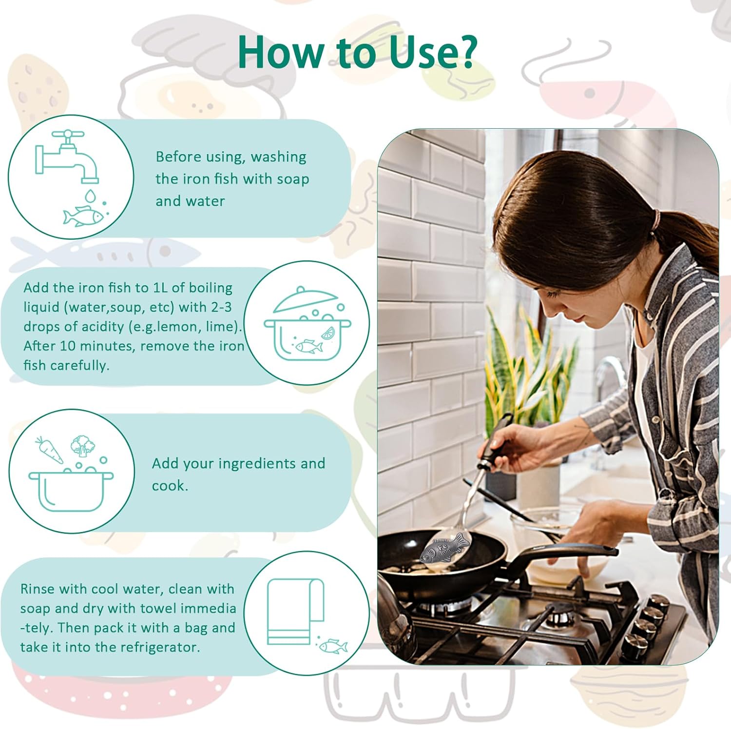 Add the Iron Fish + a few drops of acidity (e.g., lemon juice) to 1L boiling liquid, simmer 10 minutes, remove the fish, then continue cooking your ingredients as usual. Reusable for long-term daily use.